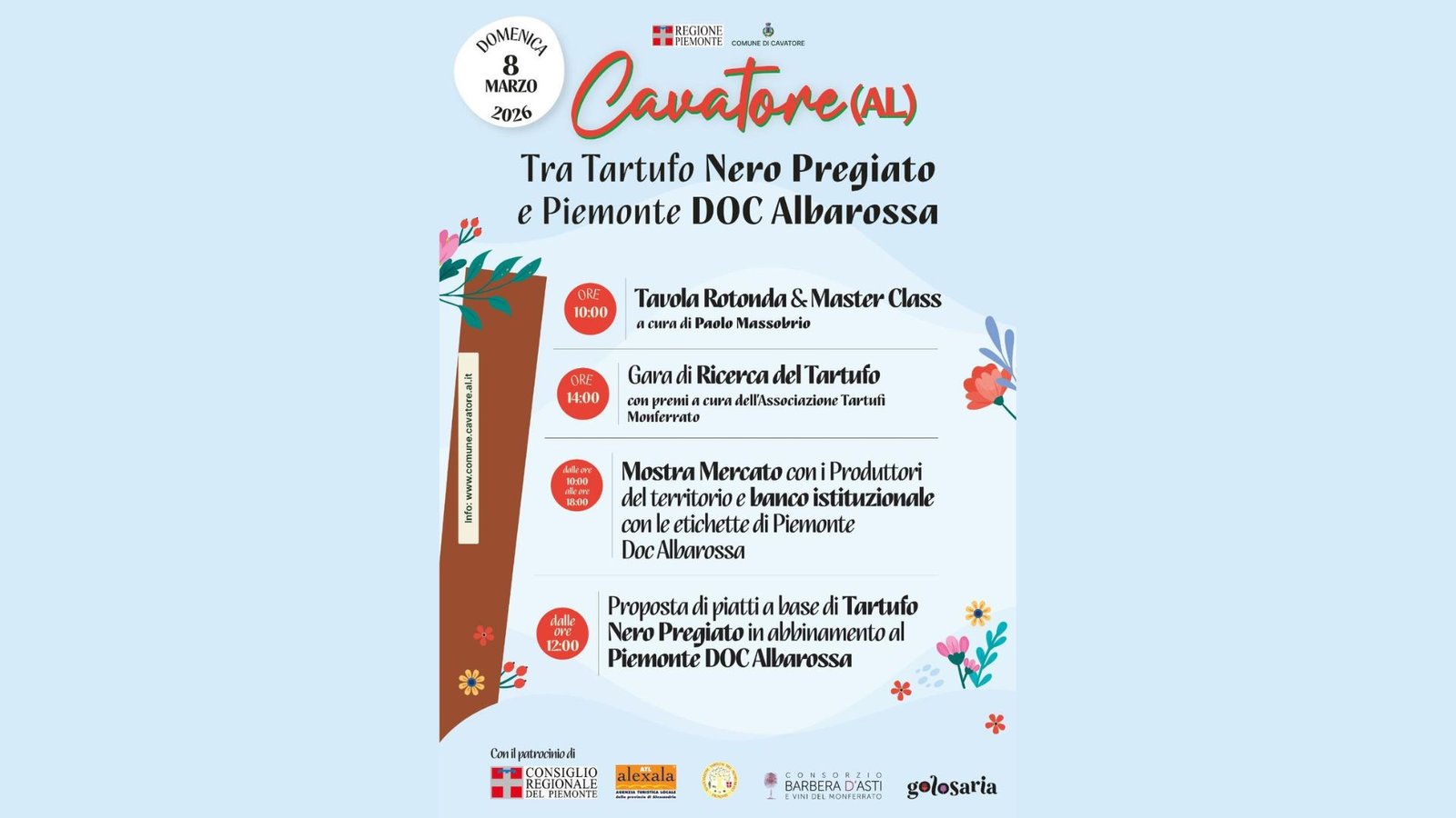 Domenica 8 marzo 2026, a Cavatore (AL), va in scena l’evento “Cavatore tra tartufo nero pregiato e Piemonte DOC Albarossa”. L’iniziativa è realizzata dal Comune di Cavatore in collaborazione con il Consorzio Barbera d’Asti e Vini del Monferrato, la Regione Piemonte, Golosaria, Alexala e l’Associazione Tartufai del Monferrato.