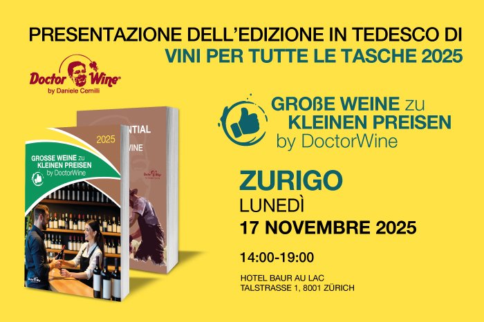 Il 17 novembre 2025 DoctorWine va a Zurigo: degustazione in occasione della presentazione della guida tascabile ”Große Weine zu kleinen Preisen 2025“ (Vini per tutte le tasche) |
