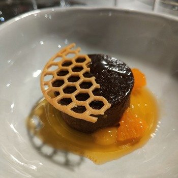 Tra i primi spicca l’agnolotto doppio di faraona, farcito con ricotta, fegatini e crema di erbe amare. Tra i secondi, da segnalare la coda di rana pescatrice al curry verde con kiwi e taccole. In chiusura, un dolce tipicamente umbro, rivisitato con eleganza: crescionda spoletina, caramello e mandarino.