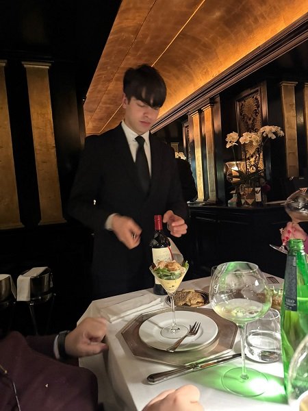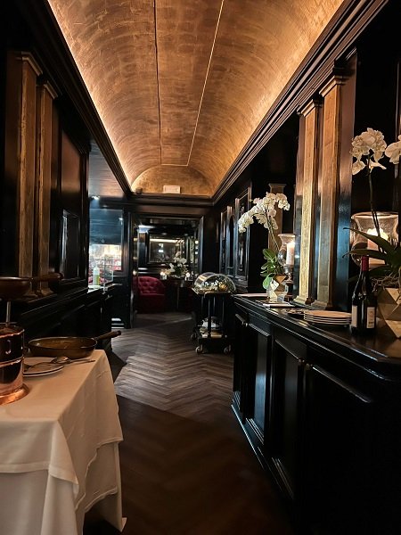 Il locale è di grande successo, elegante, nelle sue tonalità scure, giustamente illuminato e con tavoli ben apparecchiati ed anche bei bicchieri dove bere buon vino. La cucina non è certo d’avanguardia. Se proprio volessimo incasellarla, è più da anni Ottanta. Ma comunque è una classificazione che non rende merito alla varietà delle proposte, alla sua solidità ed alla sua qualità.