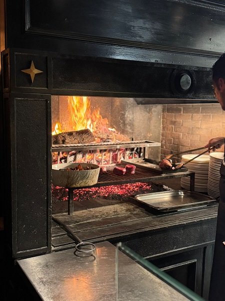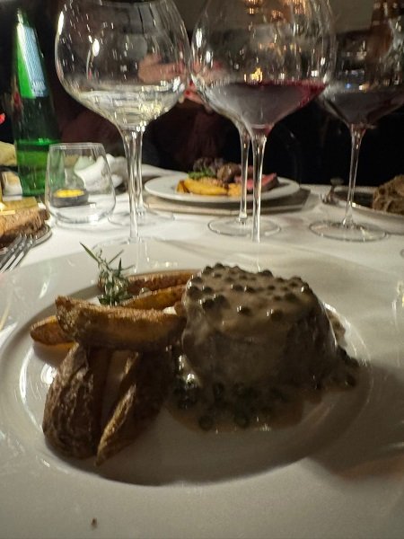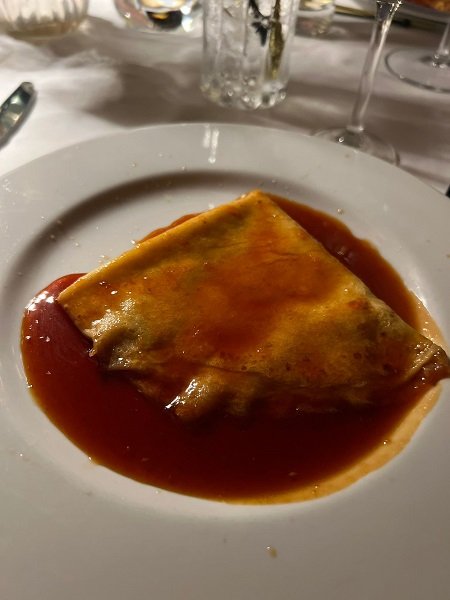 Ad esempio ho scelto di assaggiare quattro grandi classici: un ottimo Cocktail di gamberi, servito in una coppa Martini; delle splendide Tagliatelline condite con un classicissimo ragù. Un Filetto al pepe verde di perfetta cottura e succulente piacevolezza; per finire, una classicissima Crepe Suzette, cotta al tavolo, alla lampada, dal bravissimo e disponibile maître. Ecco, se proprio dovessi consigliarvi un approccio sicuramente molto buono, appena entrati nel locale, guardate il grande braciere per la cottura a vista dei vari tagli di carne: sappiate che non è per bellezza. Lo sanno usare molto bene.
