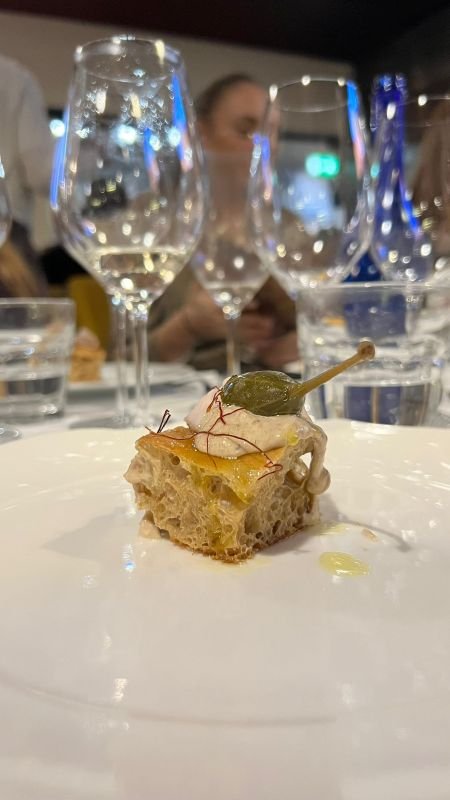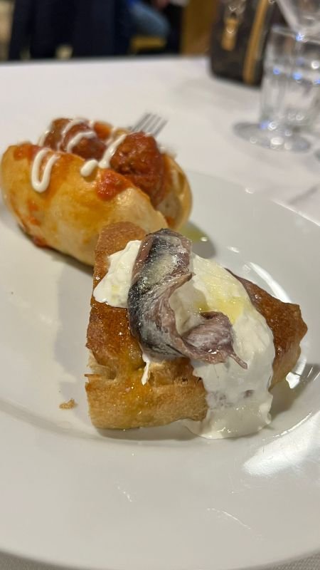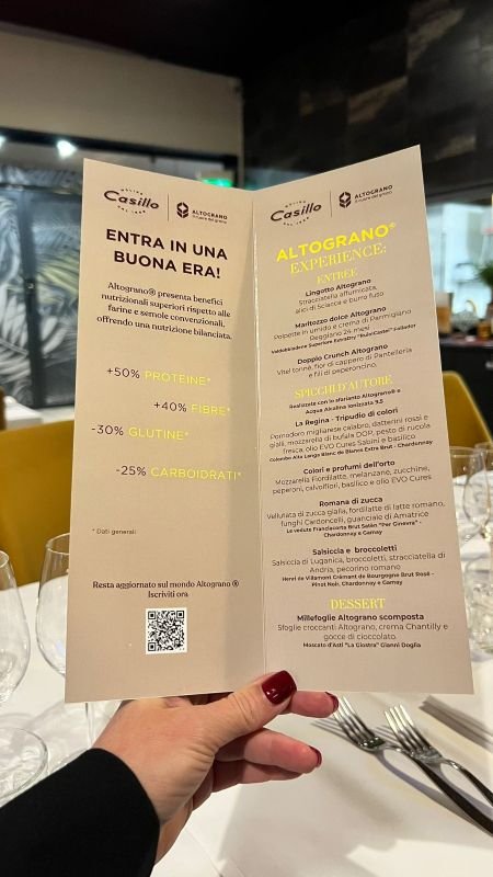 Iniziamo col dire che il ristorante è molto bello, pulito, elegante, ben apparecchiato, con ampie sale ed ampie vetrate. La serata era tutta dedicata alle pizze e dunque, a parte alcuni prelibati bocconcini gourmet serviti all’inizio (Lingotto di Altograno; Stracciatella affumicata, alici di Sciacca e burro fuso; Polpette in umido e crema di Parmigiano Reggiano 24 mesi; Doppio crunch di Altograno; Vitel tonné, fior di cappero di Pantelleria e fili di peperoncino) e la finale millefoglie scomposta, non abbiamo mangiato altro che pizza.