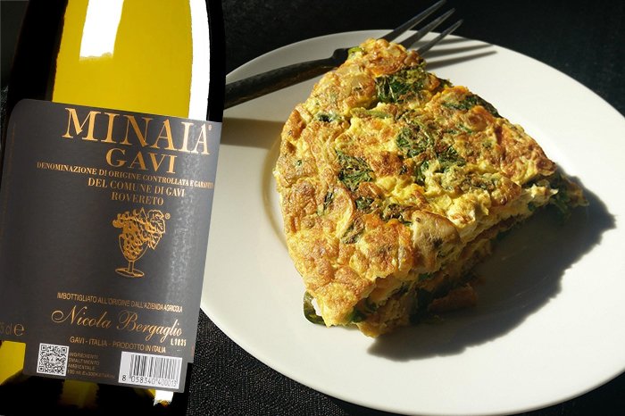 La frittata con zucchine, peperoni, melanzane, pomodorini e spinaci ha un sapore delicato e leggero, ma allo stesso tempo aromatico. Si sposa perfettamente con il Gavi del Comune di Gavi Minaia 2023 di Nicola Bergaglio.