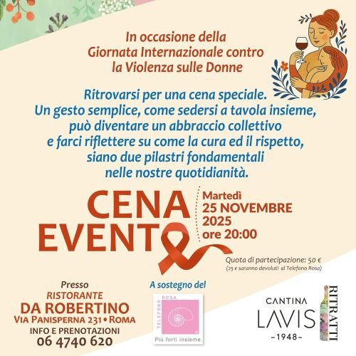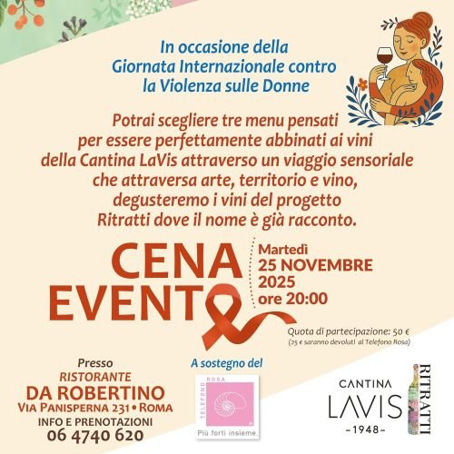 In the heart of the Monti district, Da Robertino restaurant hosted an evening dedicated to the International Day Against Violence Against Women, with a solidarity dinner to concretely support the National Pink Phone. Protagonist of the wine trail proposed to the guests was the La-Vis Winery, a historic Trentino cooperative, which presented in Rome the relaunch of its recently renovated Ritratti line.