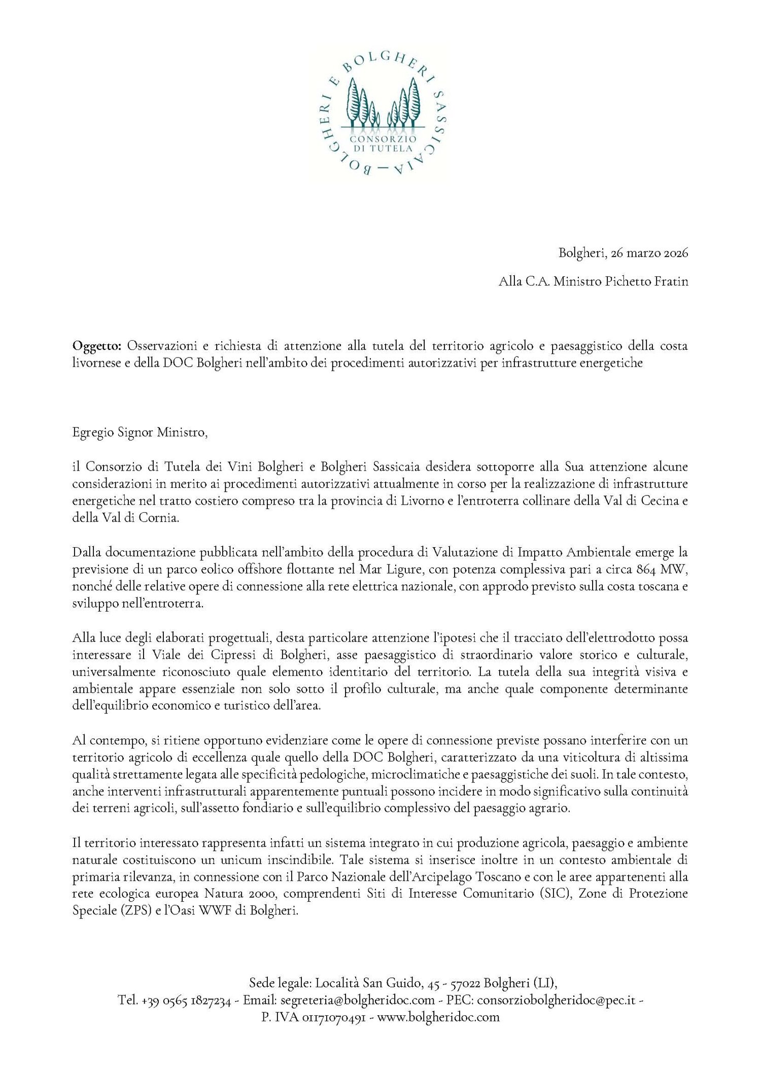 Il Consorzio Bolgheri e Bolgheri Sassicaia interviene sul progetto eolico offshore nel Mar Ligure scrivendo al ministro dell’ Ambiente e della Sicurezza Energetica. Preoccupazioni per le opere di connessione e possibili impatti su paesaggio, Viale dei Cipressi e continuità viticola.