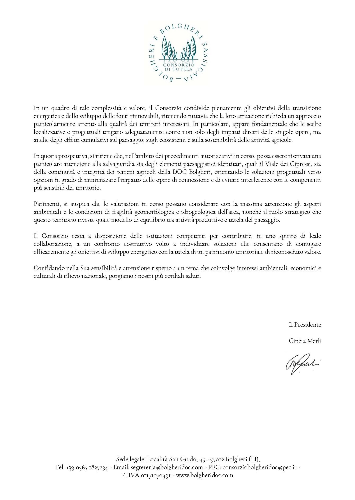 “Il Consorzio condivide pienamente gli obiettivi della transizione energetica, ma ritiene imprescindibile che ogni intervento sia valutato con estrema attenzione rispetto alle specificità dei territori coinvolti – ha dichiarato la presidente Cinzia Merli. – Il paesaggio, l’integrità dei suoli agricoli e l’identità produttiva della DOC Bolgheri rappresentano un patrimonio non replicabile, che deve essere tutelato attraverso scelte progettuali capaci di minimizzare gli impatti e salvaguardare le aree più sensibili”.