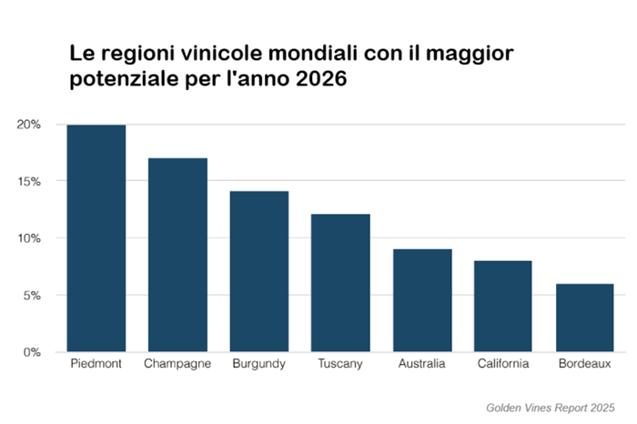 Parallelamente, crescono l’attenzione per regioni alternative, per vigneti storici, per produttori coerenti nel tempo. Non a caso, il Piemonte guida la classifica delle regioni con maggior potenziale di crescita nel 2026, davanti a Champagne e Borgogna.